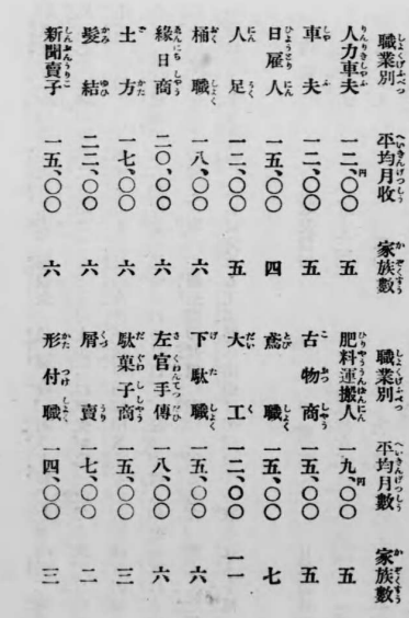 が其の主なるもので、尚、このほか工夫、点灯夫、魚膓商、あさり買い、納豆売等、凡そ七十余種の職業に分類させる。数の上からは車夫が第一位で人夫、日雇い、車力、土方、屑拾いという順序である。又其の女房子供の内職中、その主なるものは次の如くであって、幾分余裕があるかの如く思惟されるけれど、これ等副収入のある処は大抵四人以上の家族を有する向きで、寧ろ一層悲惨の状態に陥っている方だ。而してこれら細民の子は男女共、九歳位になれば何れも工場等へ出かけて行って一家の収入を補っているのである。