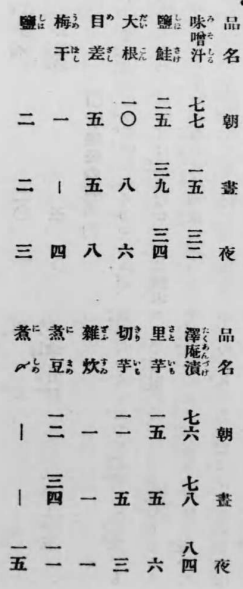 さて彼等細民の副食物に移るのであるが、彼等だからといって必ずしも不味いものばかり食っているとは限らない。時に鮪のヌタで焼酎三合がトコも傾けることも無きにしも非ずだ。所謂、高等細民の称である二十円内外の安月給なんぞより遥かに数を言っている場合もある。しかし、其の彼等に不時の収入があったとか、日和続きとか特殊の場合に於ける贅沢であって、平素は目も当てられぬ様である。最近本所の或る特殊小学校でこの程、彼等児童三百近くに就いて、朝昼晩の副食物調査を行った結果によると、三百近く中、朝昼晩共、沢庵ばかり食っているものが七十六人、塩ばかり舐めているものが二人、日に一食しか食わぬ者が一人、朝食を摂らぬ者が一人、昼飯を食わぬ者が七十人、又、常食として白米(多くは外国米)を食う者が百五十二人、麦飯が八十二人、残飯が十一人、芋で済ますものが四人あったという。朝飯は流石に葱汁とかワカメ、大根、芋汁とか、兎に角、みそ汁が多いが梅干しだけ、沢庵だけ、塩だけというのも少なくない。昼飯は沢庵が最も多く、次は塩鮭、みそ汁、煮しめの順序である。最も少数ではあるが、鮪、鯛、目比魚の刺身なぞ贅沢なものもある。調査表中の目立ったものを掲ぐれば左の如くである。